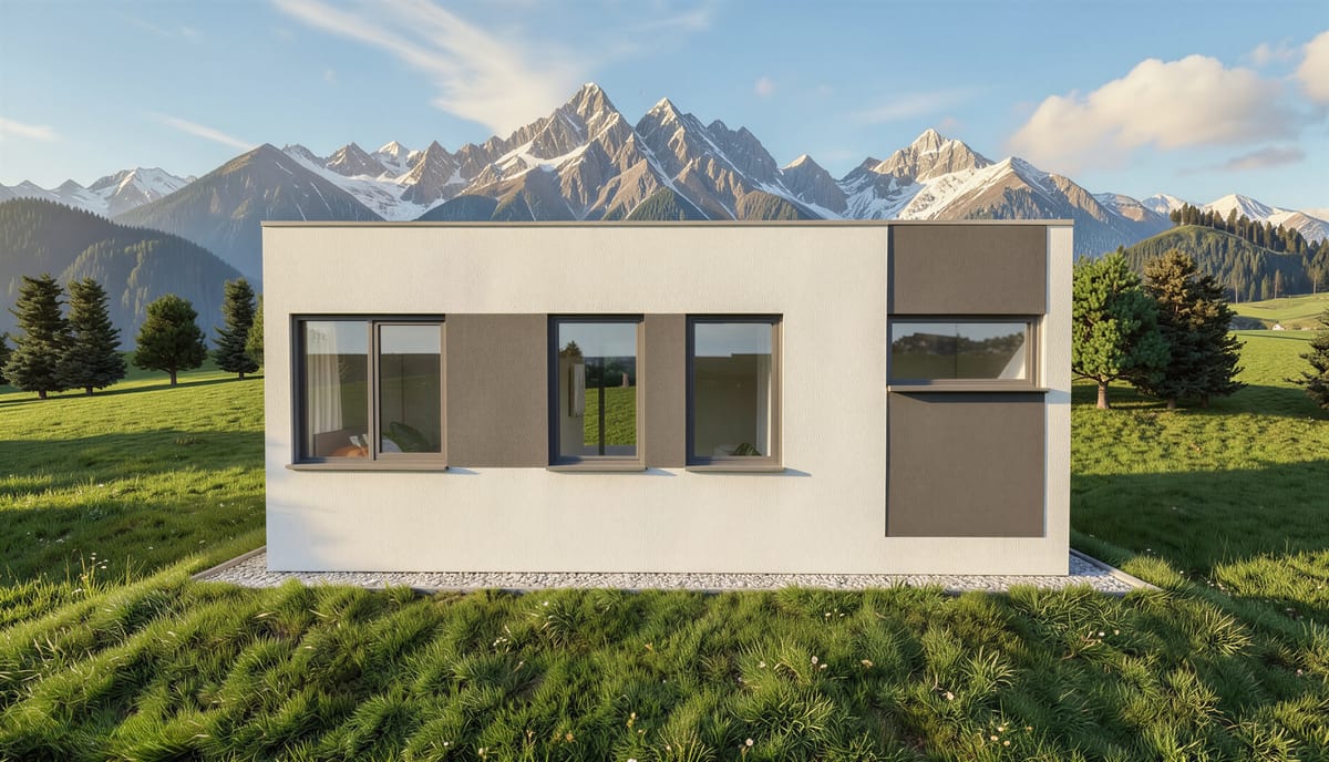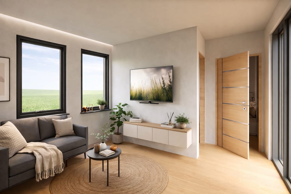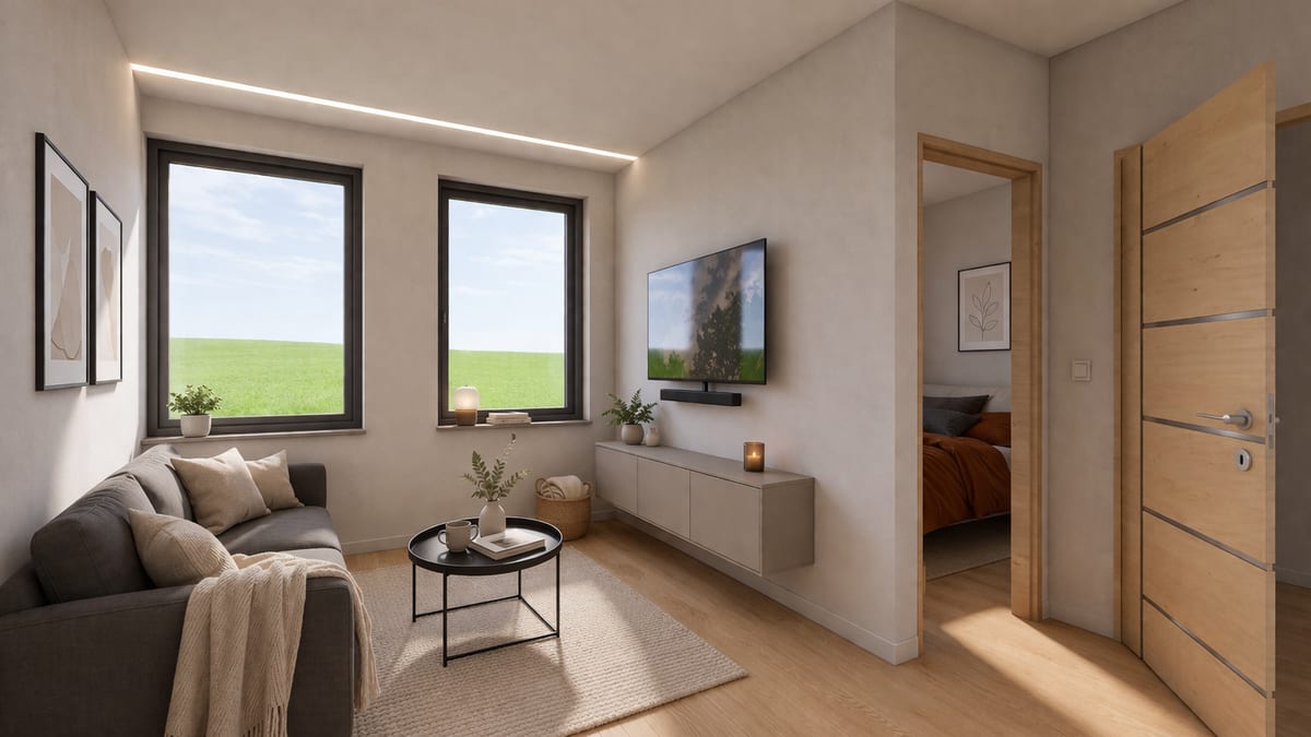 Malý, ale chytrý dům s prostorným obývacím pokojem a samostatným pokojem. Ideální pro jednotlivce, pár nebo jako startovací bydlení.