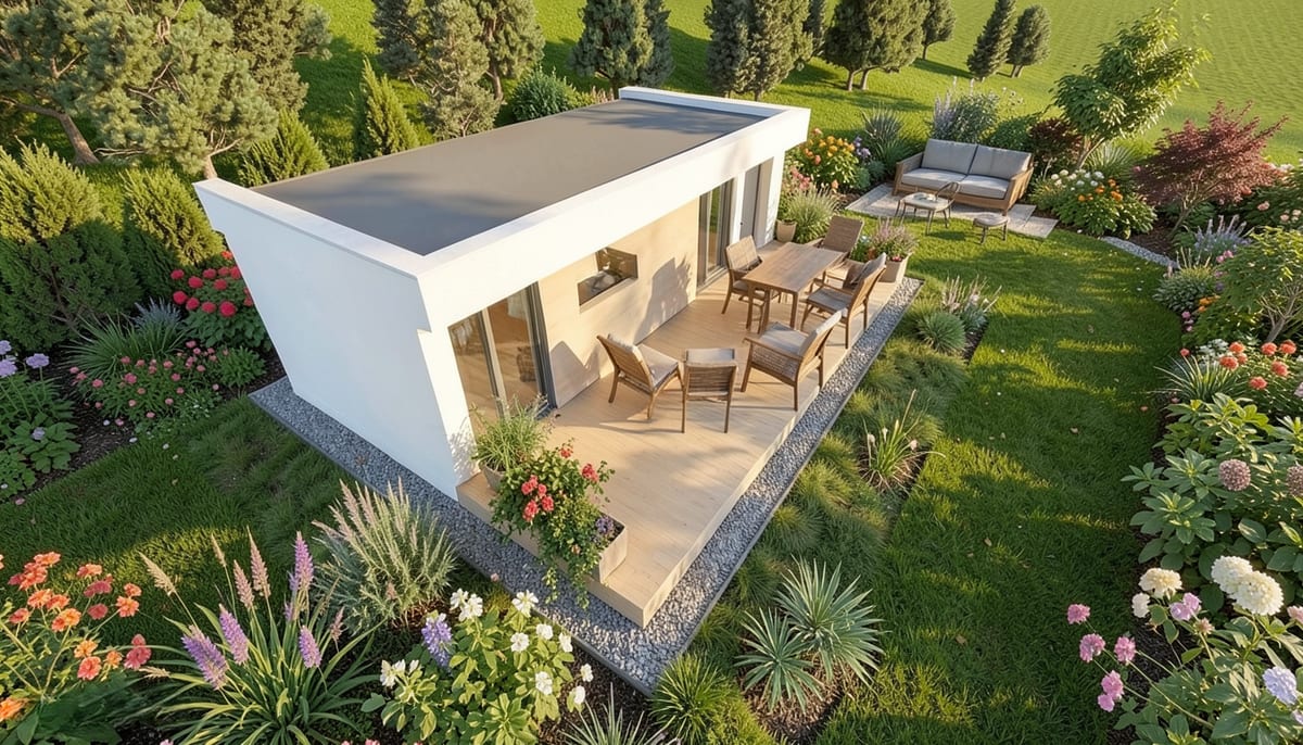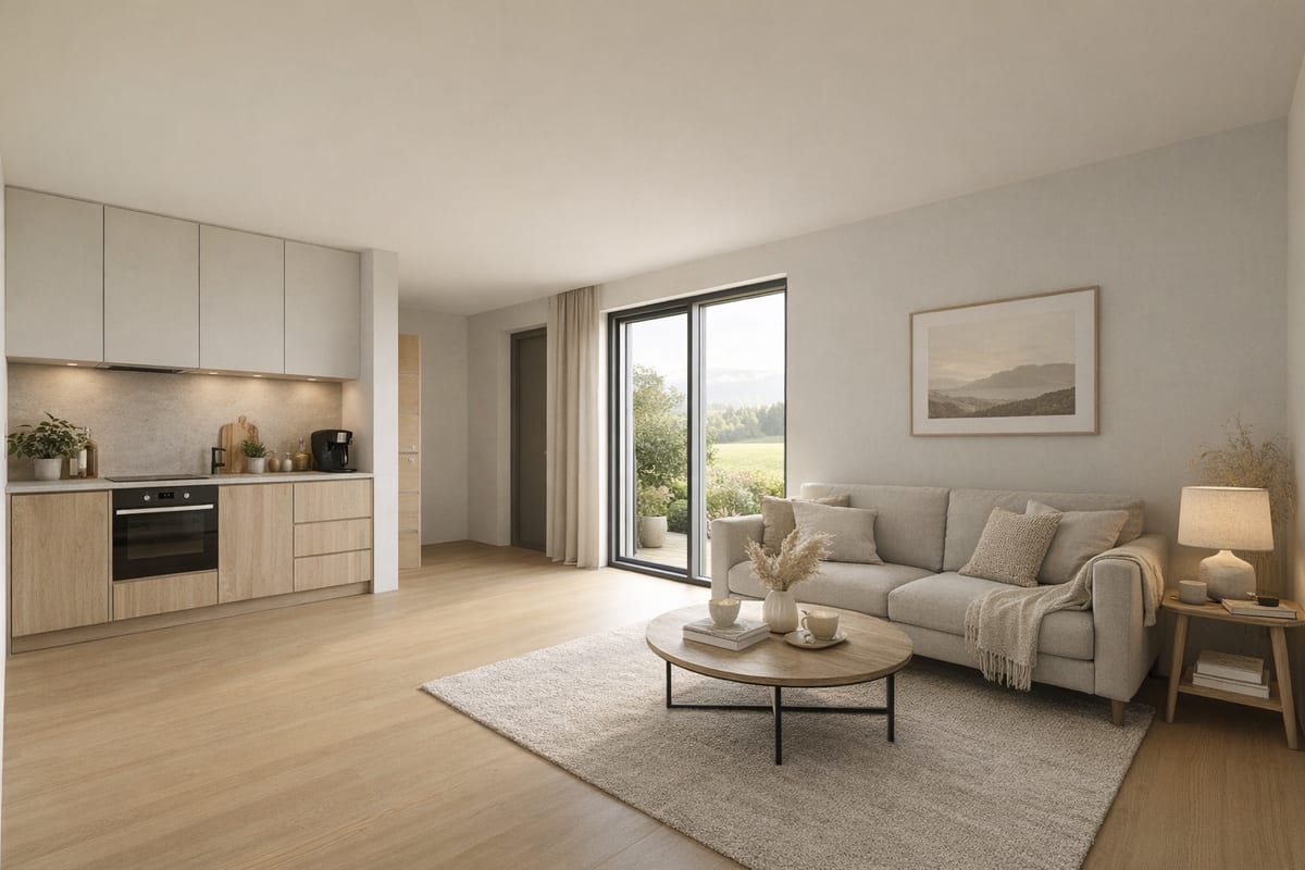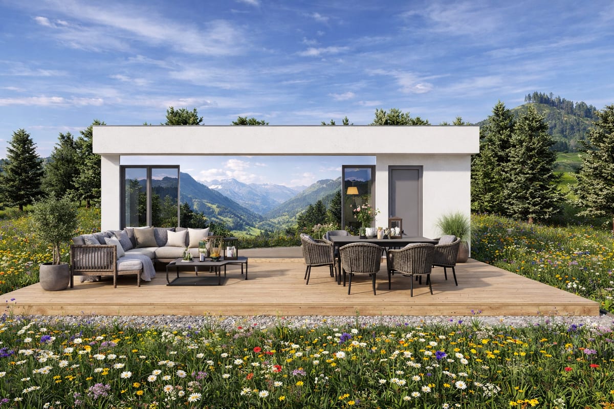 Moderní dům s otevřeným obývacím prostorem propojeným s kuchyní a samostatným pokojem. Praktické řešení pro pohodlné bydlení jedné osoby nebo páru.