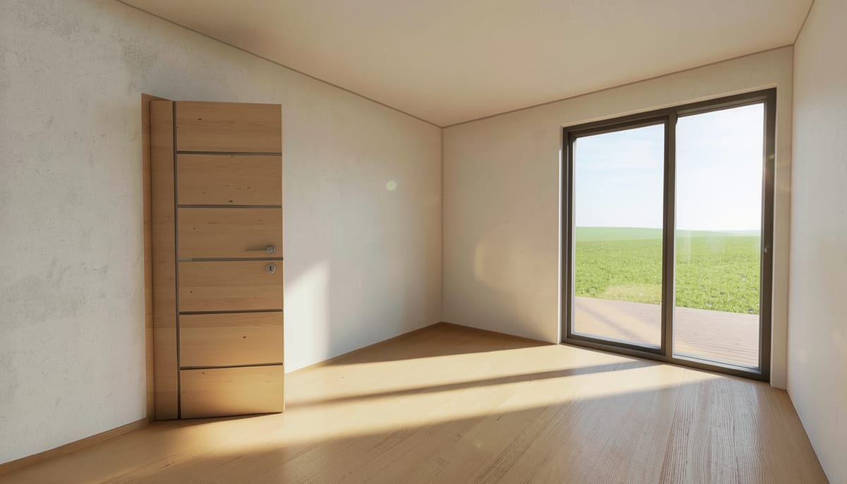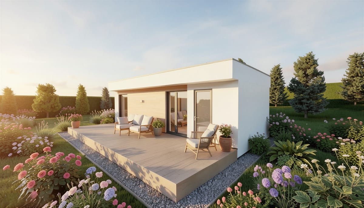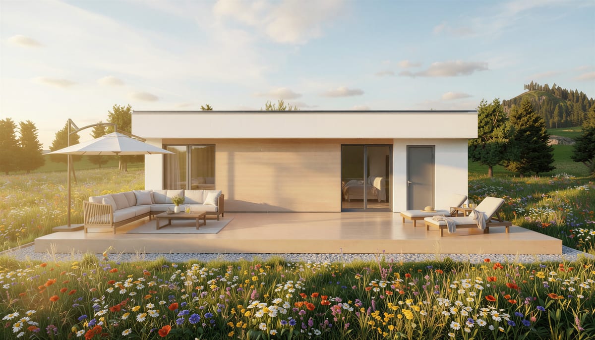 Moderní dům s otevřeným obývacím prostorem propojeným s kuchyní a samostatným pokojem. Praktické řešení pro pohodlné bydlení jedné osoby nebo páru.